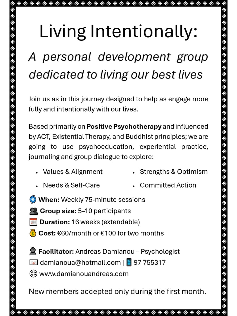 Αν θα σας ενδιέφερε να συμμετάσχετε ή να οργανώσετε μια ομαδική συνάντηση παρακαλώ επικοινωνήστε μαζί μου.
